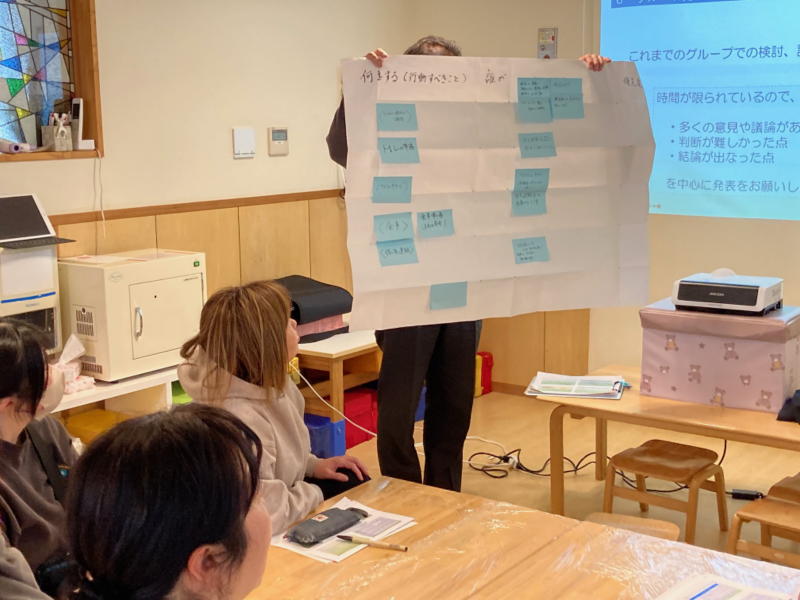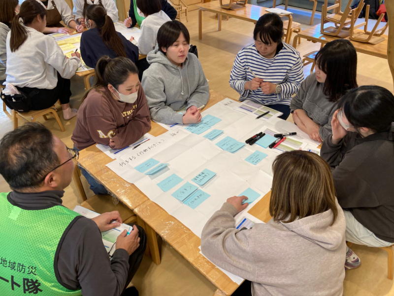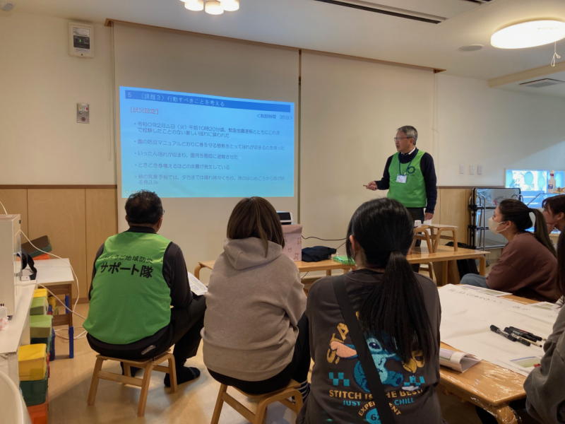 内 容;幼稚園・保育園対象のDIG訓練 ・園長からの要望でBCPをテーマに2グループに分かれて実施 ・地震の発生時刻、被害(建物、インフラ、ライフライン、けが人当)、人員などの状況を設定し、地震発生から24時間までに優先すべき行動(何を、だれが、どのように)をグループで議論 |